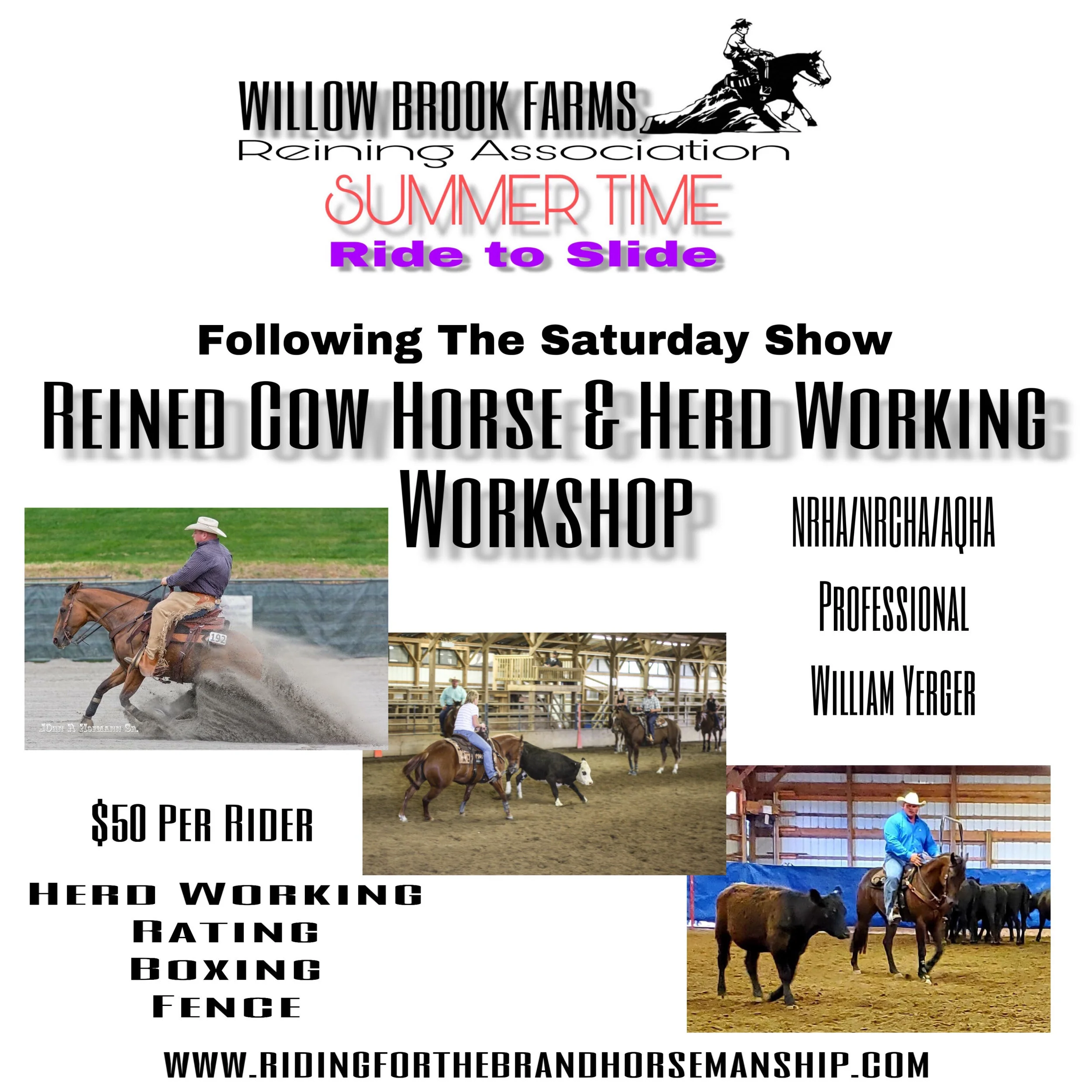 For more information, contact William Yerger at 610-621-7269 or wlyerger@gmail.com, or visit https://www.ridingforthebrandhorsemanship.com/willow-brook-farms-reining-associat.